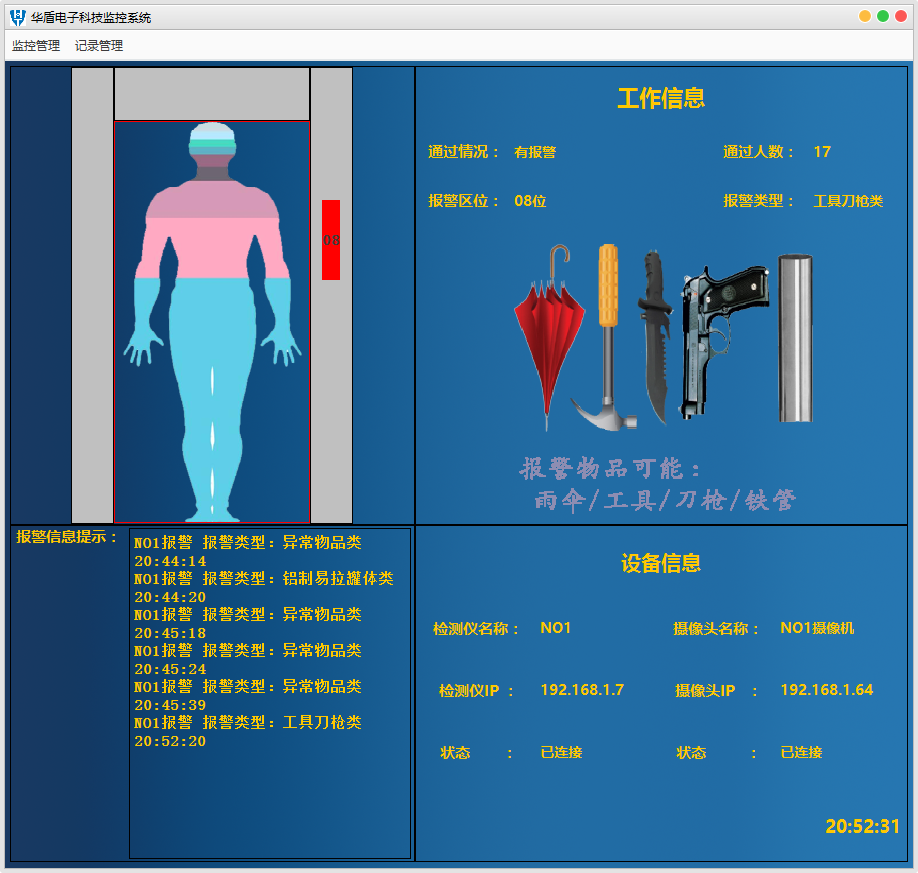 無(wú)論被檢人員身上有沒(méi)有攜帶手機(jī)、手表、鑰匙、皮帶扣等物品干擾的情況下,都能檢測(cè)到被檢人員身上的黑色金屬危險(xiǎn)品(鐵制砍刀、鐵制槍支、鐵管、馬口鐵罐等)和有色金屬危險(xiǎn)品(鋁制易拉罐體、銅制鋁制管體及各種金屬管體和各種金屬罐體),以及被檢人員身上攜帶的為了增大殺傷力里面放了鋼釘和鋼砂的非金屬外殼的炸彈。檢測(cè)速度0.5秒以內(nèi),通行效率40人/min以上。